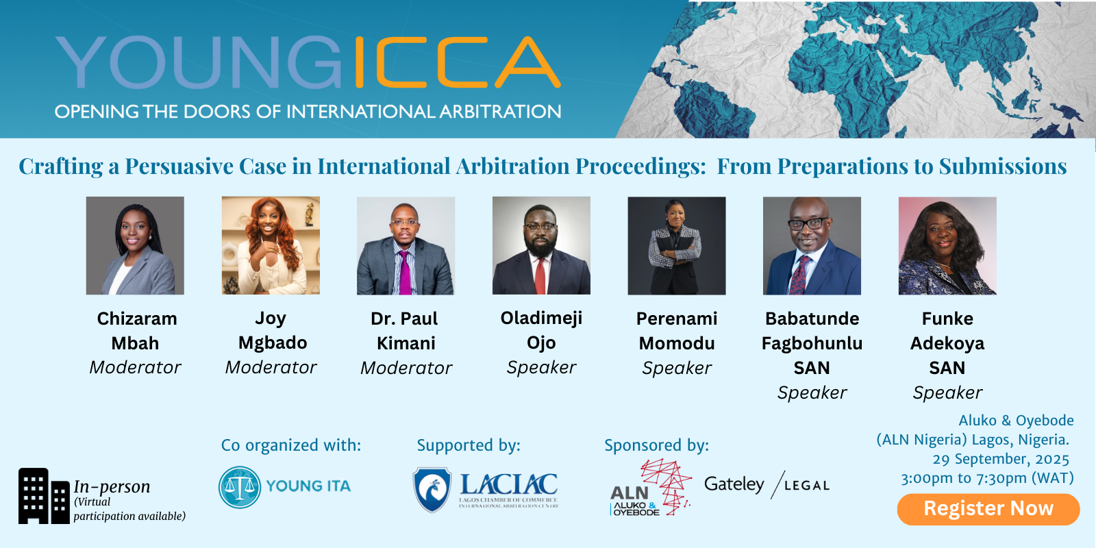 Young ICCA and Young ITA are pleased to invite you to an interactive workshop on "Crafting a Persuasive Case in International Arbitration Proceedings: From Preparations to Submissions", scheduled on 29 September 2025, both virtually and in-person in Lagos, Nigeria. This event aims to equip young practitioners with skills and tips needed to build a persuasive case, from case preparations to written and oral submissions, ensuring that arguments are both legally sound and compelling.